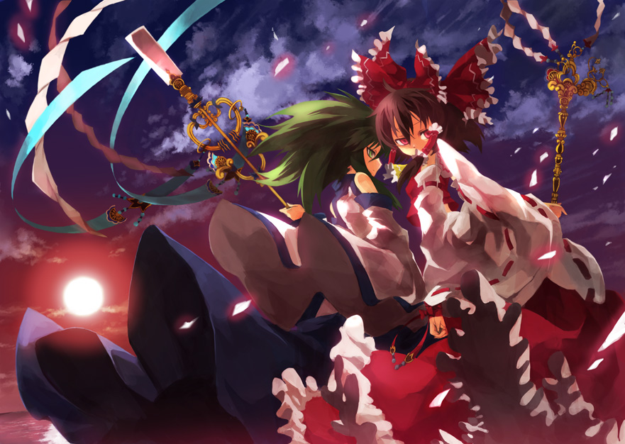 2girlsalternate weaponbowbrown hairdetached sleevesfemale focusgoheigreen eyesgreen hairhair bowmultiple girlsred eyessceptershidesunsunsetweapon