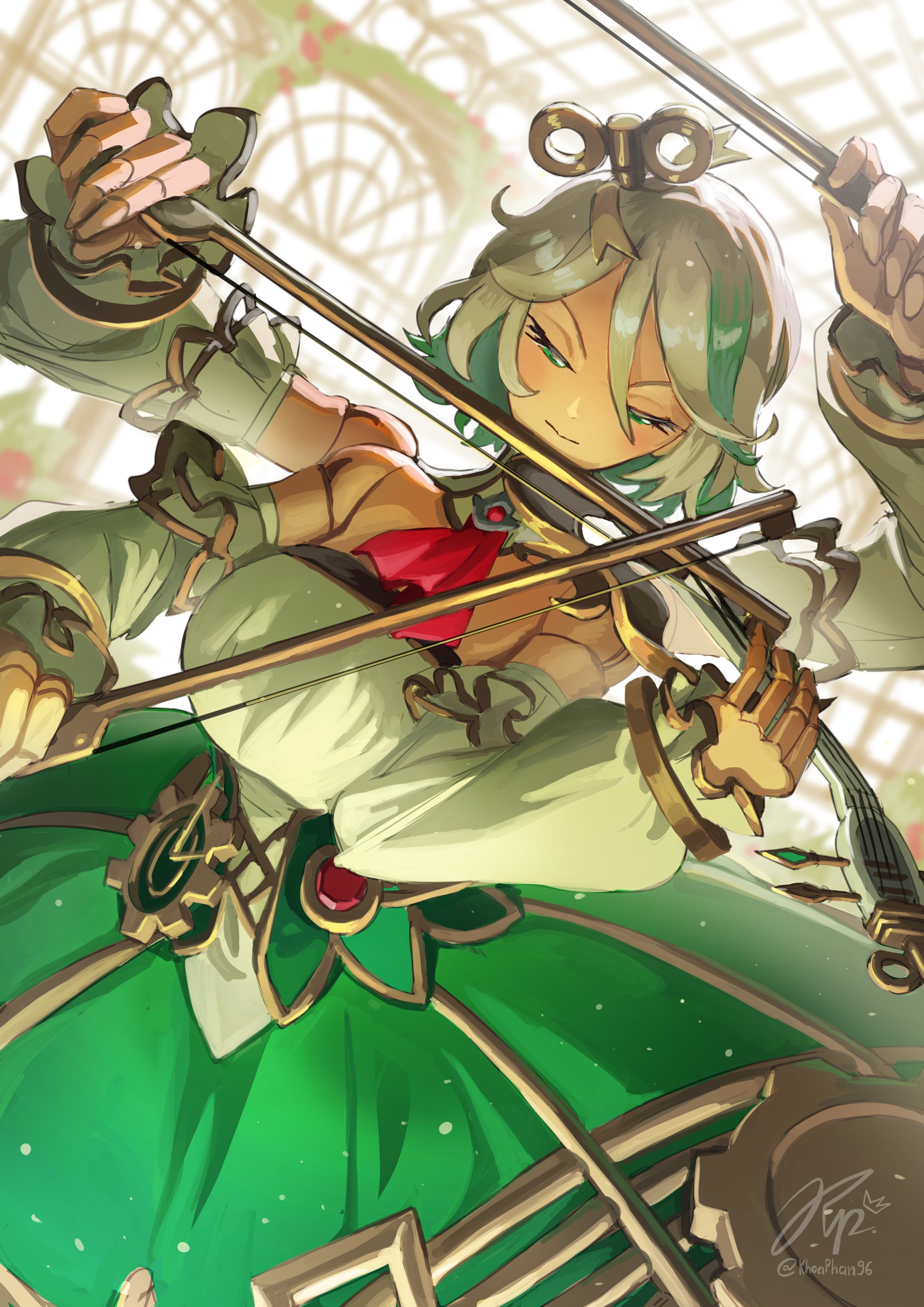yashahime (momotarou densetsu), momotarou densetsu, 1girl, blue hair, female focus, green eyes, horns, japanese clothes, long hair, pointy ears, single horn, solo, wristband