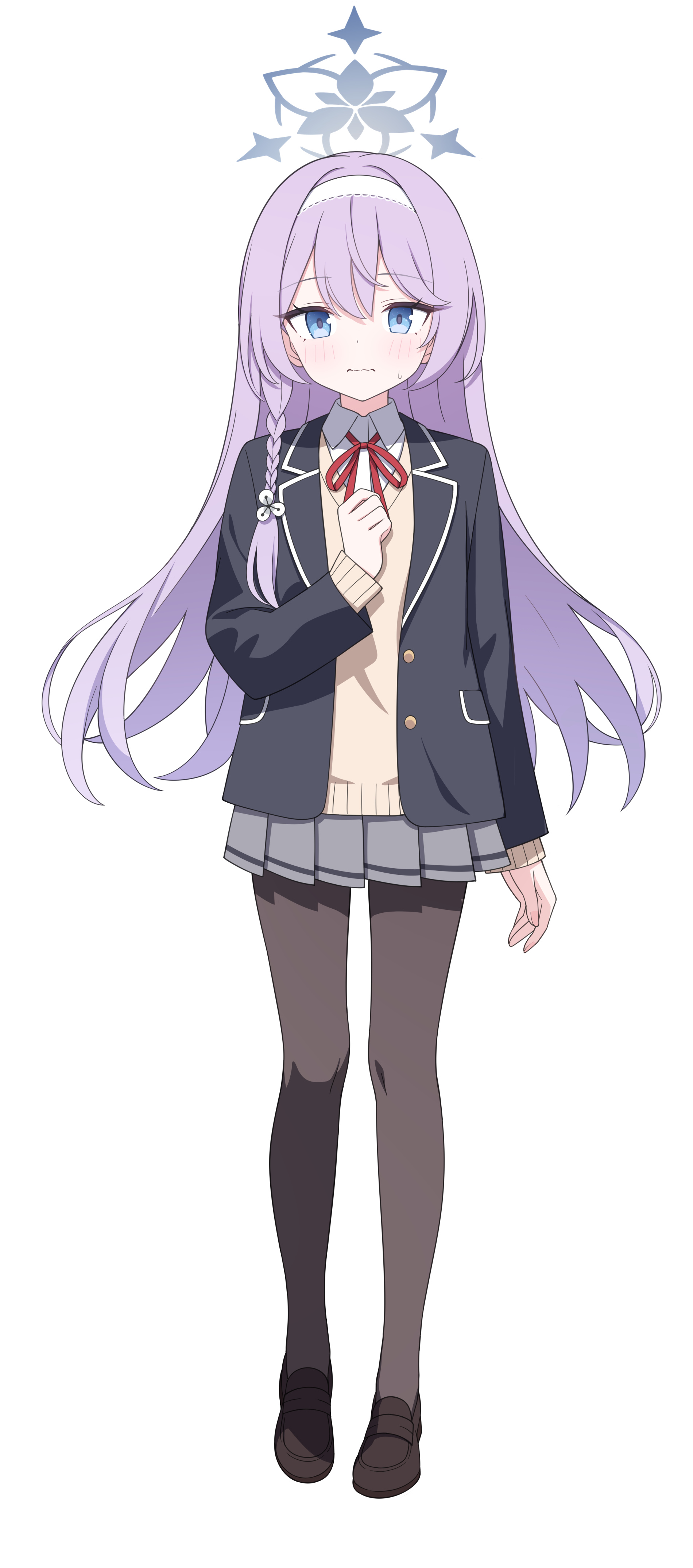 1girlarm at sideblack jacketblazerblue eyesblushbraidbrown pantyhosebrown shoesbrown sweaterbuttonsclosed mouthcollared shirtdouble-parted bangsembarrassedfull bodygradient eyesgradient halogrey halogrey skirthair between eyeshair ornamenthairbandhalohand on own chesthand upjacketlapelslayered sleeveslong hairlong sleeveslooking at viewerminiskirtmulticolored eyesmulticolored haloneck ribbonopen clothesopen jacketpantyhosepleated skirtpocketpurple hairred ribbonribbonschool uniformshirtshoesside braidsidelockssimple backgroundsingle braidskirtsolostandingstraight hairstraight-onsweatdropsweatertachi-etransparent backgroundwavy mouthwhite hairbandwhite shirt