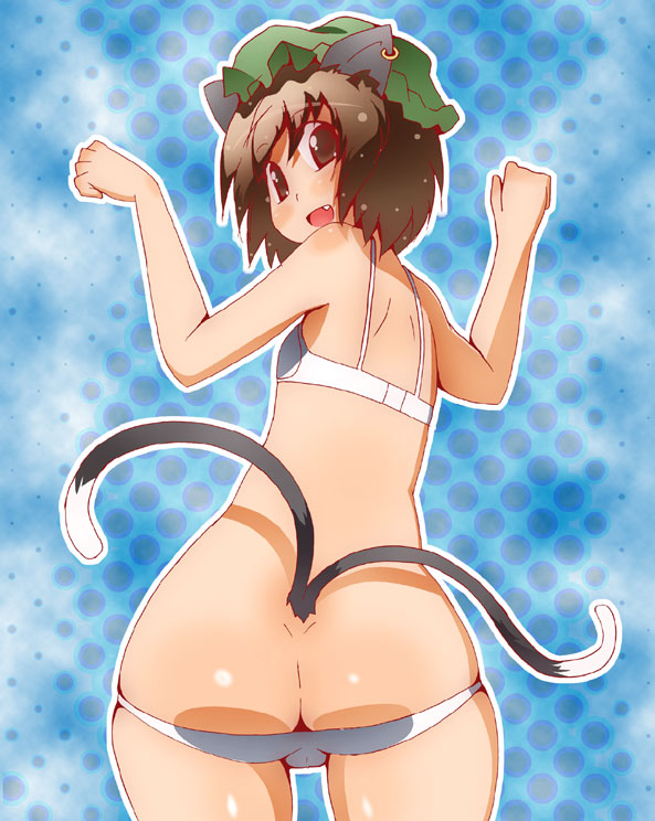 :d1girlanimal earsassbikinibrabrown eyesbrown hairbutt crackcat earscat tailearringsfangfemale focusfrom behindhatjewelrylingerielooking backlowleglowleg bikinimultiple tailsopen mouthpaw poseshort hairskindentationsmilesoloswimsuittailunderwearwhite bikini