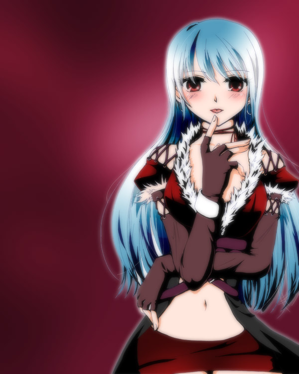 1girlarm under breastsblack coatblue hairblushbreastsbrown glovescoatcowboy shotelbow glovesfingerless glovesfingernailsfur trimfur-trimmed coatgloveshand uplong hairlooking at viewermedium breastsmidriffnavelopen clothesopen coatred backgroundred eyesred skirtskirtsolotonguetongue outyuzu (myrica)