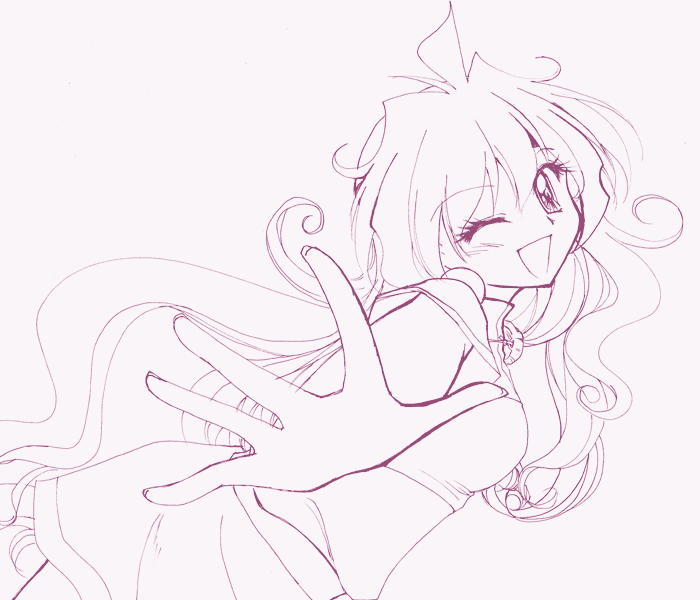 1girlbreastscowboy shotdresslineartlong hairlooking at viewermedium breastsmonochromeone eye closedopen mouthpurple themeshort sleevessimple backgroundsketchsmilesoloyuzu (myrica)