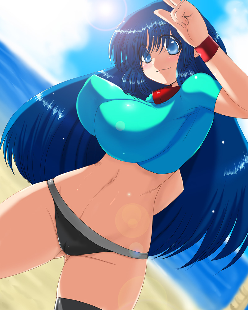 santa (sunflower), hanami ume, gakuen idolmaster, idolmaster, absurdres, highres, 1girl, ahoge, animal ears, animal hands, bare shoulders, blue sailor collar, blue skirt, blush, breasts, brown eyes, brown hair, cat ears, cat tail, choker, covered erect nipples, crop top, crop top overhang, gloves, hair bun, large breasts, looking at viewer, microskirt, navel, paw gloves, sailor collar, shirt, short hair, skirt, sleeveless, sleeveless shirt, solo, tail, thighhighs, thighs, white gloves, white shirt, white thighhighs