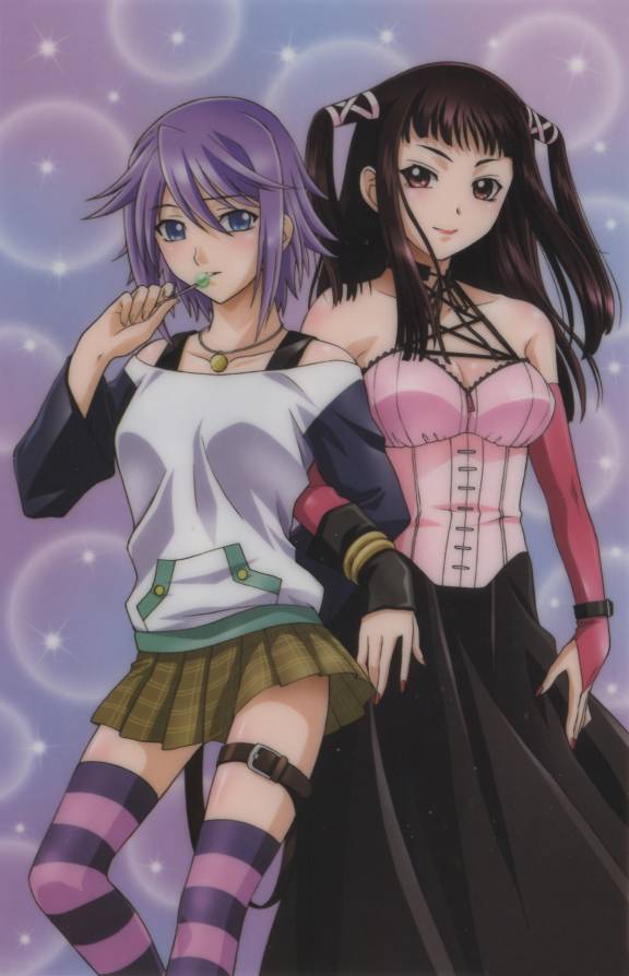 00s2girlsblue eyesbrown haircandyfoodlollipoplong hairmultiple girlsnail polishpurple hairred eyesred nailsshort hairstriped clothesstriped thighhighsthigh strapthighhighswitch
