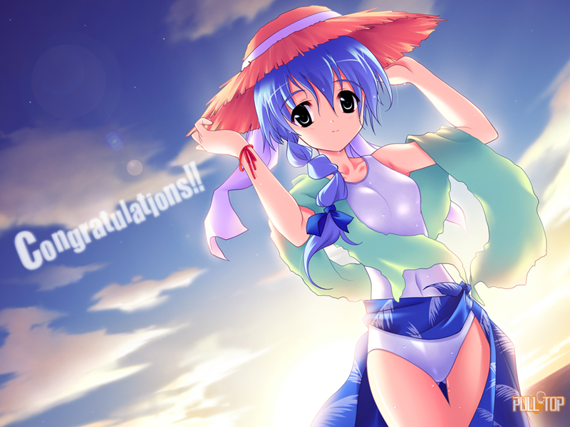 1girlbeachblack eyesblue eyesblue hairbraidcloudcongratulationsdutch anglefemale focushatlong hairmatching hair/eyesone-piece swimsuitsarongshiny clothesskysmilesolostraw hatsunsetswimsuittowel