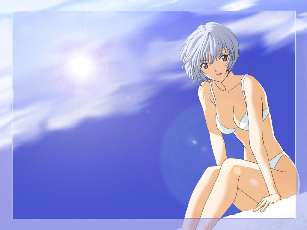 1girlbikiniblue haircloudcurvydayfemale focuslegslens flarelong legsred eyesshiny skinshort hairskysoloswimsuitthongthong bikiniwide hips