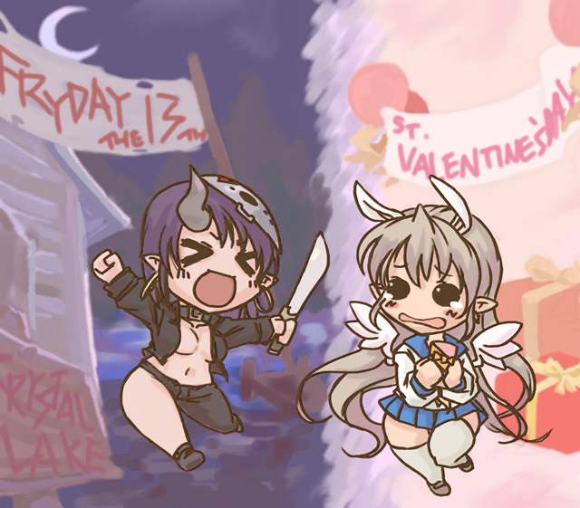 1boy2girlsbrown hairchibiclosed eyeshockey maskknifelong hairmaskmultiple girlsopen clothesopen shirtpurple hairschool uniformshirtshort hairvalentine