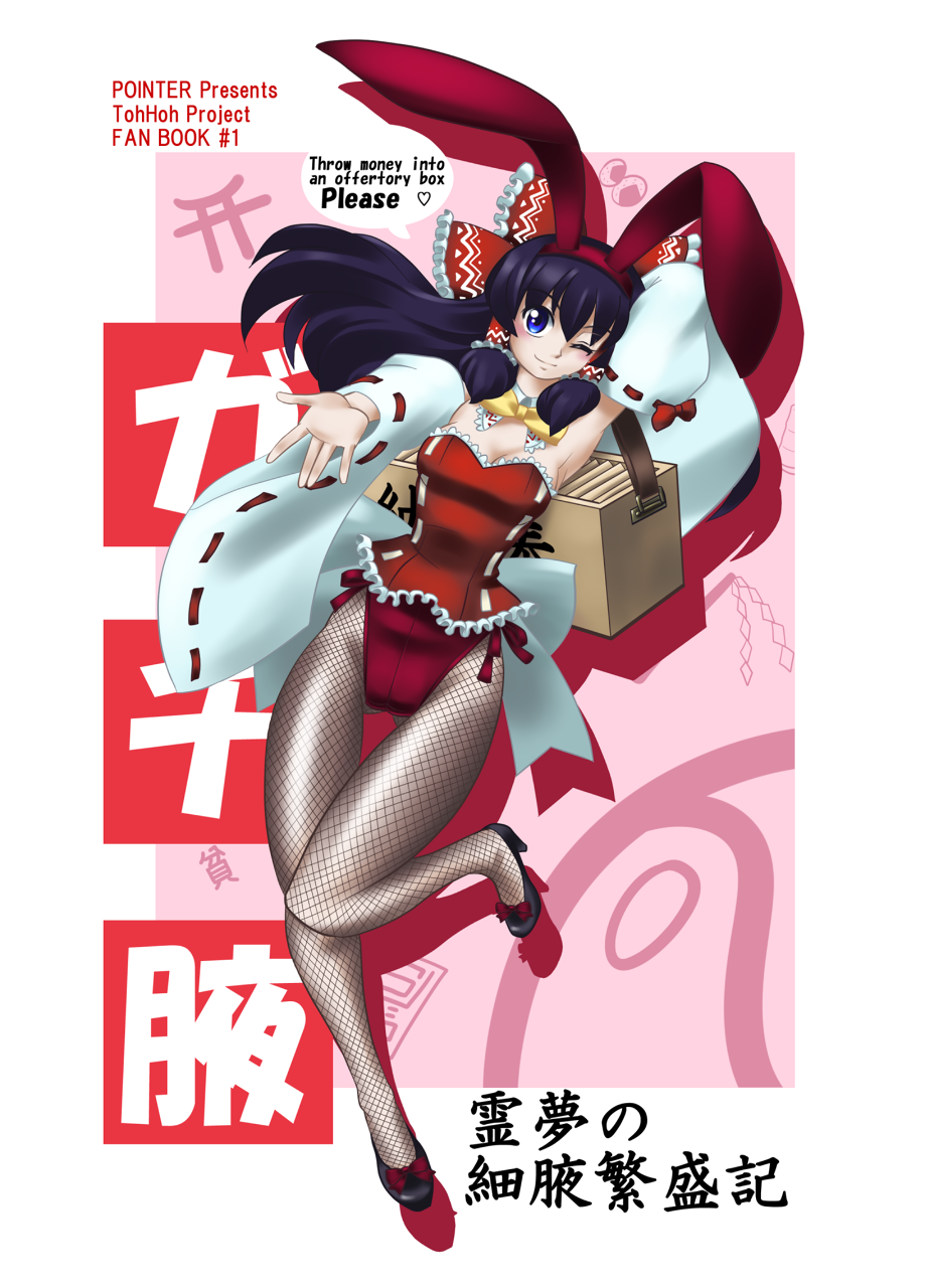 1girlanimal earsblack hairblue eyesboxdonation boxfemale focusfishnet pantyhosefishnetsfull bodyjapanese clotheslong hairone eye closedpantyhoseplayboy bunnyrabbit earssolowhite backgroundwink
