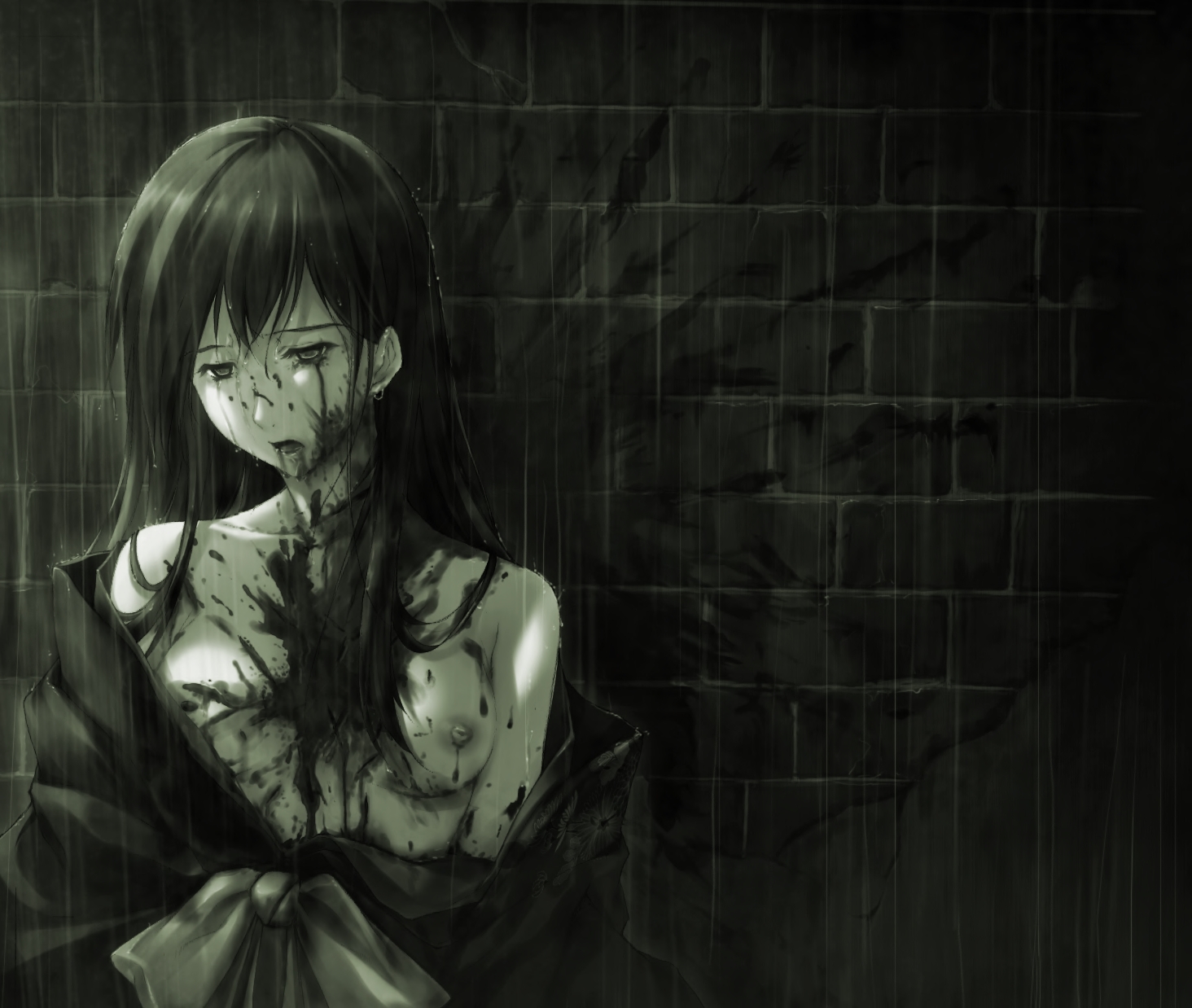 1girlagainst wallbare shouldersbleedingbloodbreastsdarkdeathdyingempty eyesero gurofemale focusgreen themeguroinjuryjapanese clotheskimonoknifelong hairmonochromenipplesno braoff shoulderopen clothesopen mouthopen shirtoutdoorspublic indecencypublic nudityrainshirtsolostabtearsupper bodywet