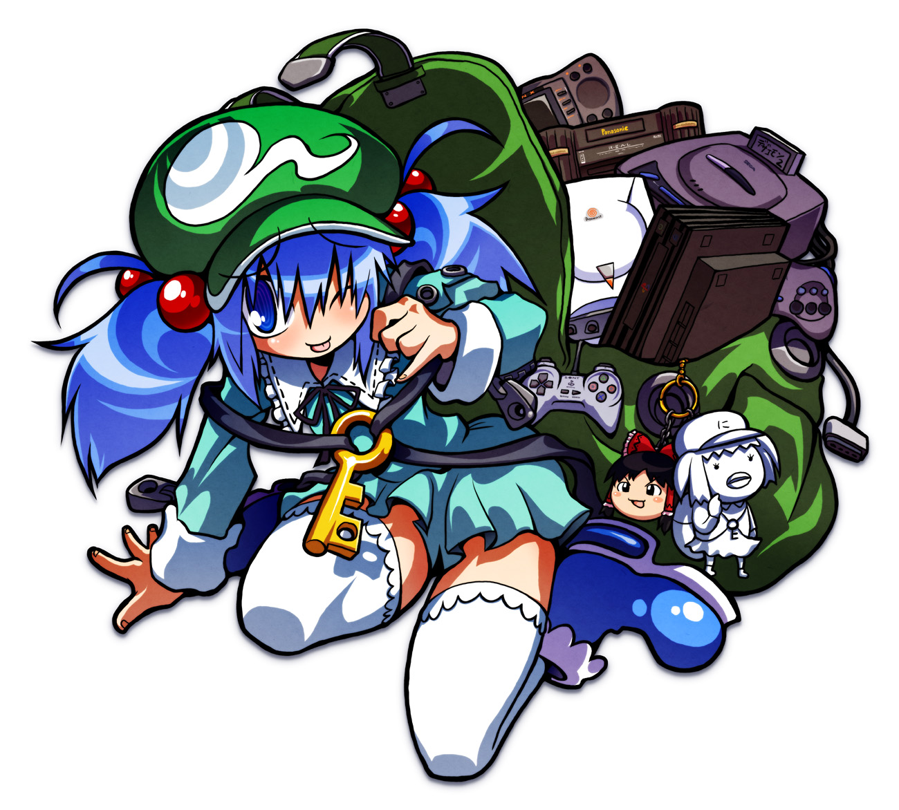 1girlbackpackbagcharm (object)female focusgame consolehair bobbleshair ornamentkeyone eye closedrandoserusolothighhighstwo side upwhite thighhighswinkyukkuri shiteitte ne