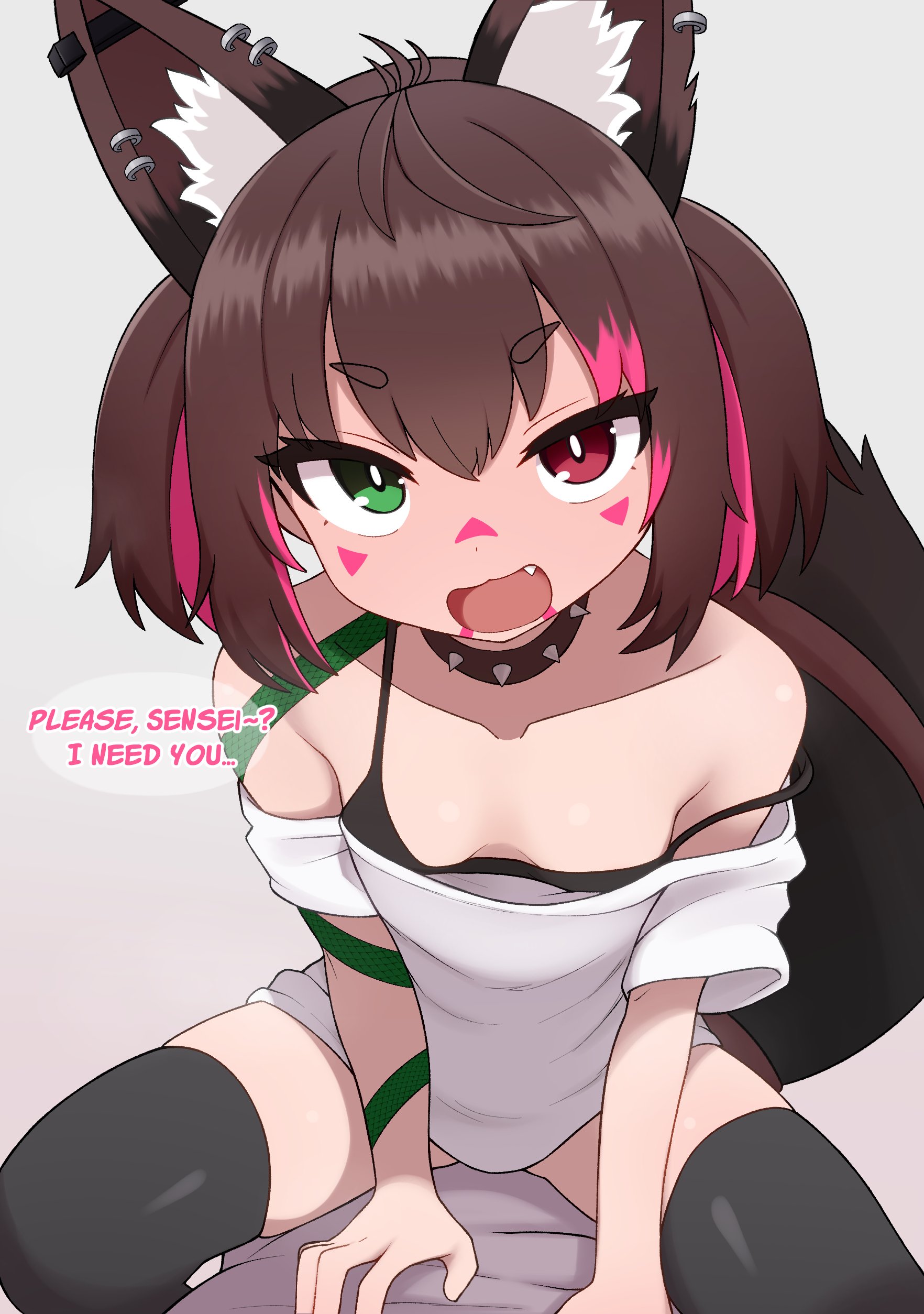 1girl1otheranimal ear piercinganimal earsantenna hairblack brablack thighhighsbrabreastsbrown haircat earscat girldownblouseenglish texteyes visible through hairfacial markfanggreen eyesheterochromiamulticolored hairoff shoulderoff-shoulder shirtopen mouthpink hairpovred eyesshirtsittingsitting on personsmall breastssmilesolo focusstrap slipstreaked hairthighhighstwintailstwo-tone hairunderwearvirtual youtuberwhite shirt