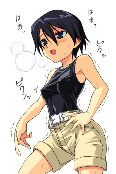 1girlbare shouldersbeltblack hairblue eyesblushbreastscovered erect nipplesfemale focusshort hairshortssmall breastssolosweattank toptrembling
