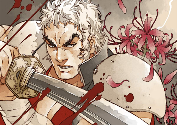 1boyakashi goujiarmorbloodflowerfurrowed browgrey backgroundholdingholding swordholding weaponmale focusmature maleparted lipspectoral cleavagepectoralsred flowershort hairshoulder armorsolospider lilyswordthick eyebrowsv-shaped eyebrowsweaponwhite hair