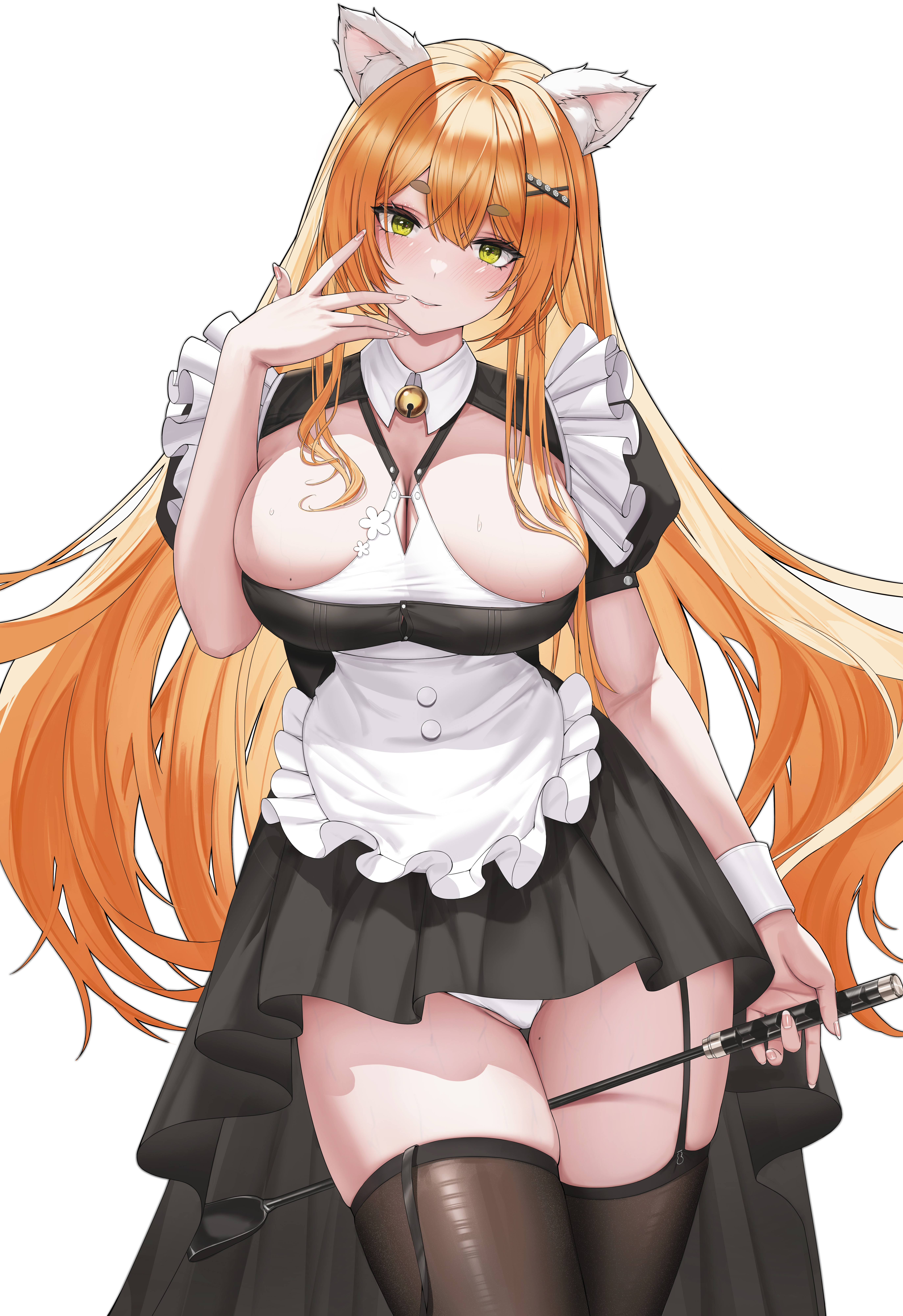 1girlailurusanimal ear fluffapronbellbetween thighsblack dressblack thighhighsblushbreastscleavagecleavage cutoutclothing cutoutcollared dressdressfrilled apronfrilled dressfrillsgarter strapsglittergreen eyesgroinhair between eyeshair ornamenthand uphead tiltholdingholding riding cropjingle belllarge breastslong hairlooking at viewermaidmaid apronmolemole on breastmole on thighorange hairpantiesparted lipsriding cropsidelockssimple backgroundsingle wrist cuffsmilesolostrap slipsweatthighhighsthighsunderwearvery long hairvirtual youtuberwhite apronwhite backgroundwhite pantieswhite wrist cuffswrist cuffsx hair ornament