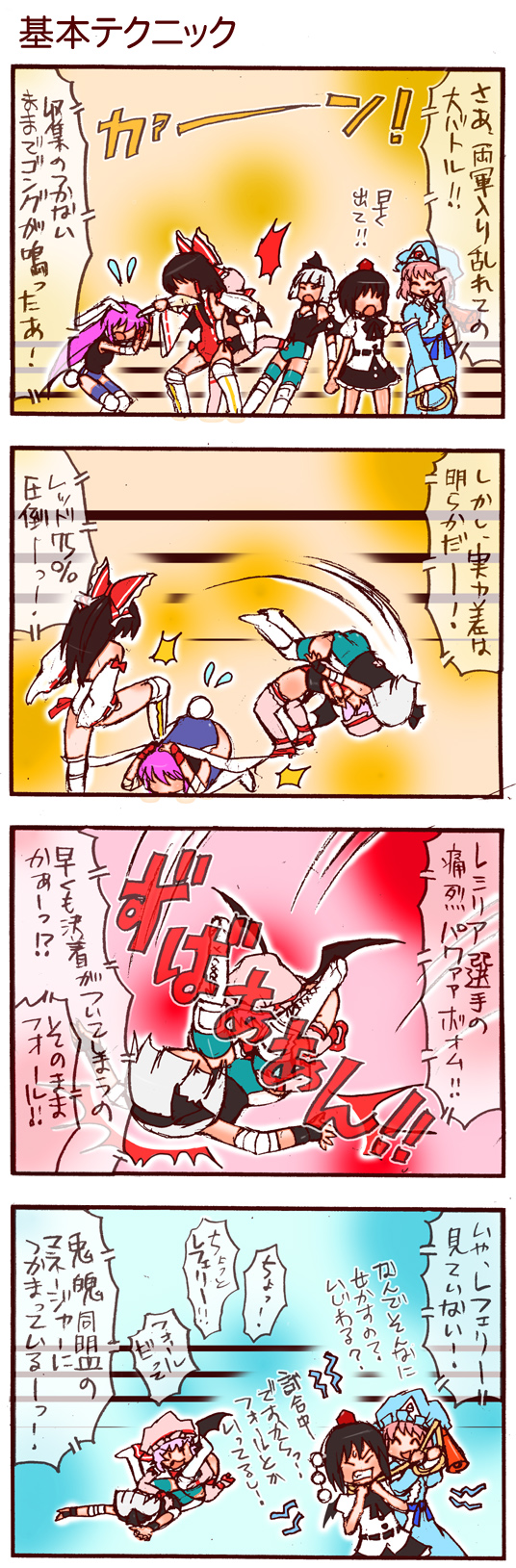 4koma6+girlsanimal earsbat wingsblack hairbowbrown haircomicfemale focushairbandhatlong hairmultiple girlspink hairpurple hairrabbit earsstranglingwhipwingswrestling