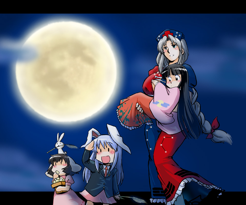 4girlsanimal earsblack hairbrown hairchibicloudfemale focuslong hairmoonmultiple girlsoutdoorsrabbit earsshort hairskystandingvery long hair