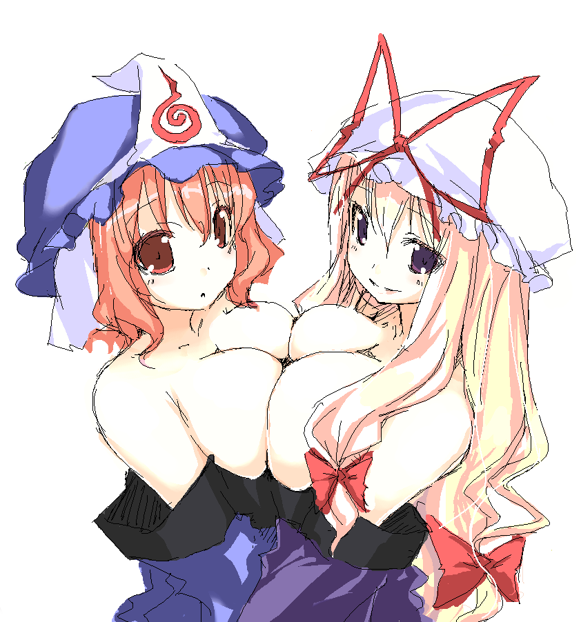 :o2girlsbare shouldersblonde hairbowbreast pressbreastscleavageclothes downfemale focushair bowhatlarge breastslong hairlooking at viewermultiple girlsoekakipink hairpurple eyesred eyesshort hairsimple backgroundsmilesymmetrical dockingveilvery long hairwhite background