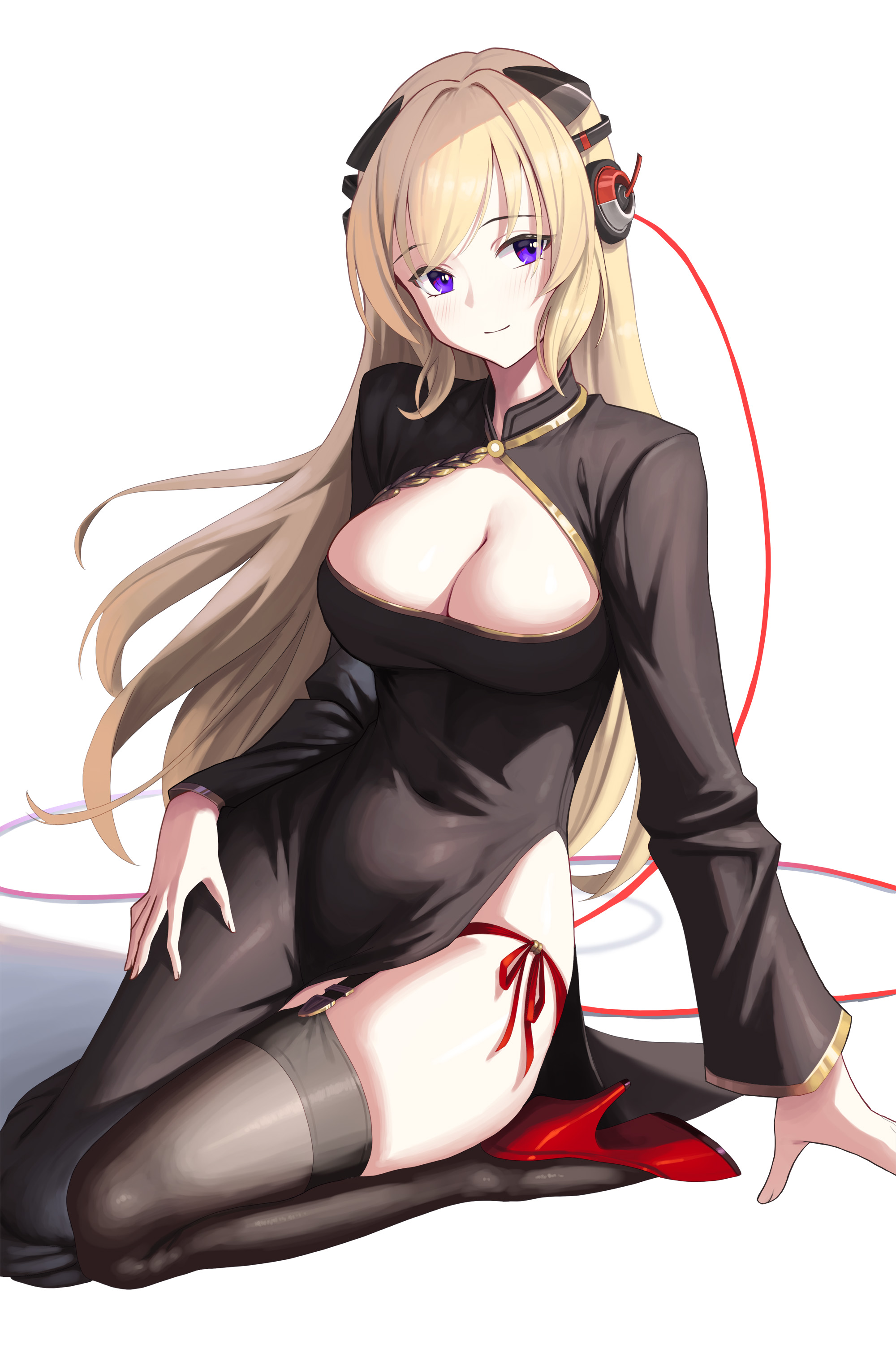 1girlblack thighhighsblonde hairbreastschina dresschinese clothescleavagecleavage cutoutclosed mouthclothing cutoutdressgold trimhigh heelslarge breastslong hairlooking at viewerpantiespanty strapspurple eyesred pantiesred shoesseizashoesside slitside-tie pantiessimple backgroundsittingskindentationsleevelesssleeveless dresssmilesolothighhighsthighsunderwearwhite background