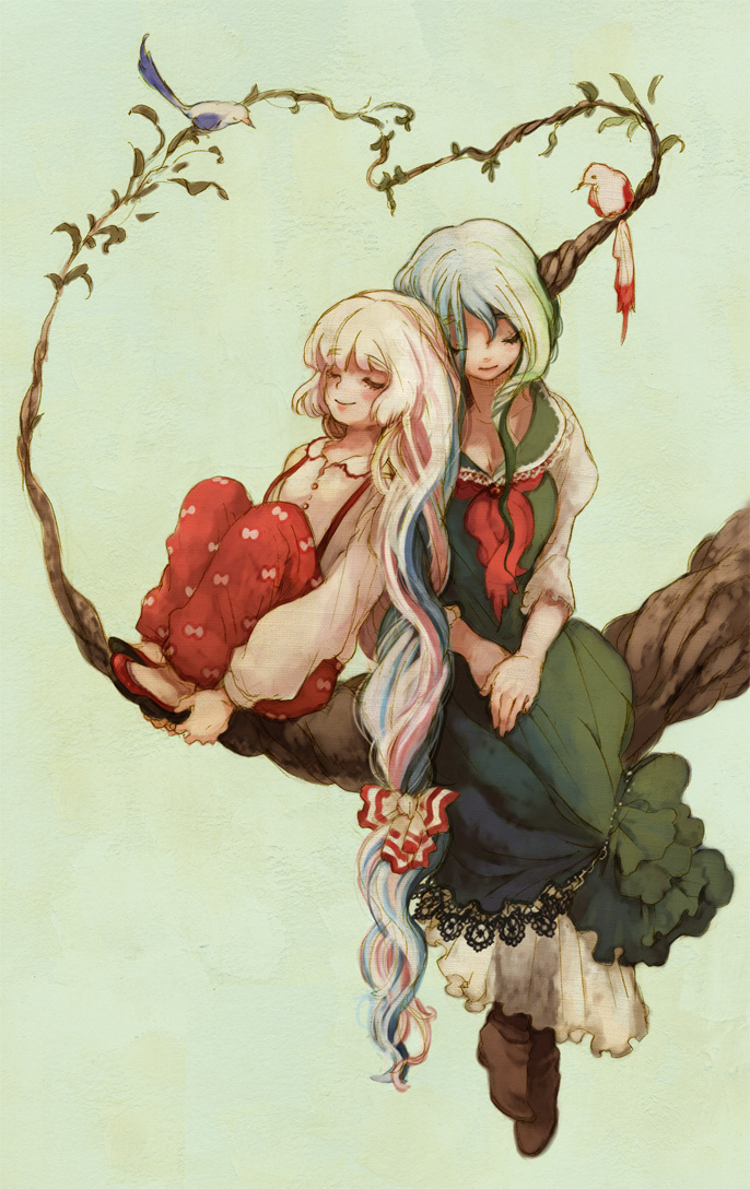 k morghania, polyester (psg), polyurethane (psg), panty & stocking with garterbelt, highres, 2boys, blue eyes, blunt bangs, brothers, colored eyelashes, earrings, girly boy, hair over one eye, jewelry, male focus, multiple boys, pink hair, red eyes, siblings, smile