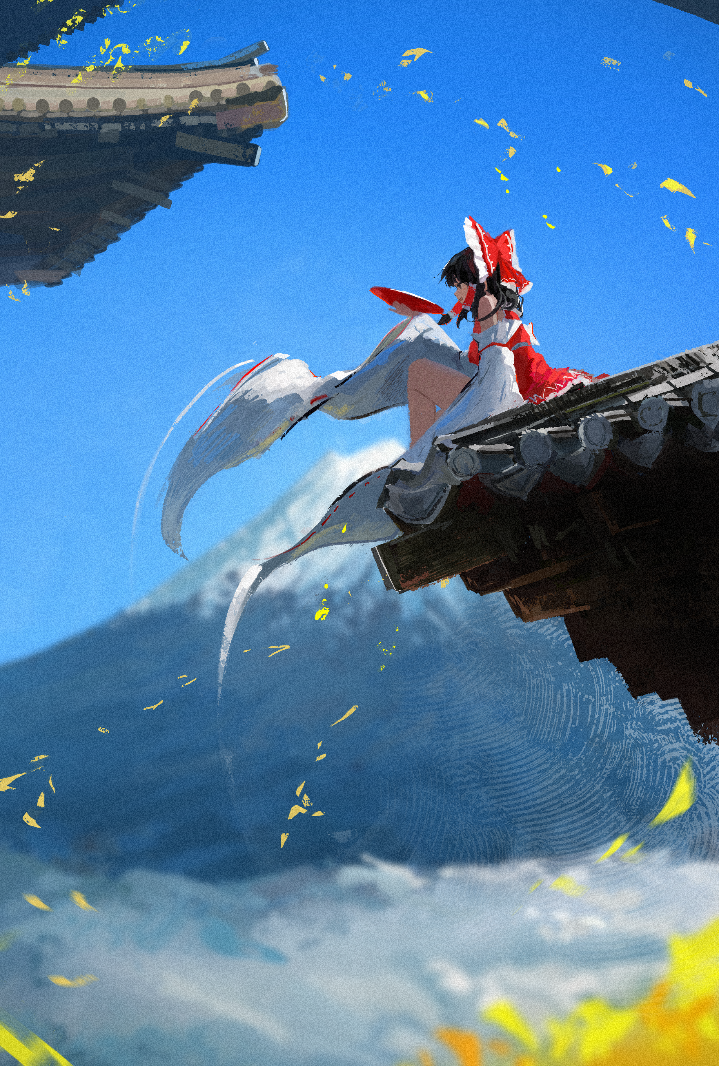 1girlascotblonde hairblushbowbrown eyesbrown hairdetached sleevesfalling leavesfrillshair bowhair tubeshatleaflong hairred bowred eyesribbonrooftopshirtshort hairskirtskysolo