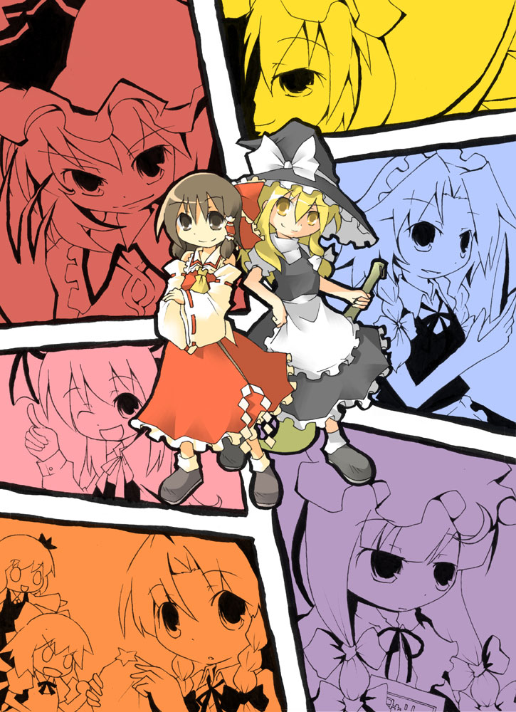 katagiri chisato, hakurei reimu, touhou, translated, 1girl, brown eyes, brown hair, female focus, flower, japanese clothes, miko, plant, ribbon, short hair, solo, white background
