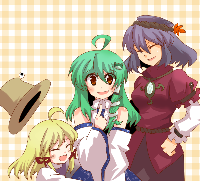 :d1boy3girlsahogebare shouldersblack hairbroochclosed eyescowboy shotdressfemale focusfrog hair ornamentgemgreen hairhair ornamenthands on own hipshathugjewelryleaf hair ornamentlooking at viewermultiple girlsnontraditional mikoopen mouthred dresssmiletaremeyuri