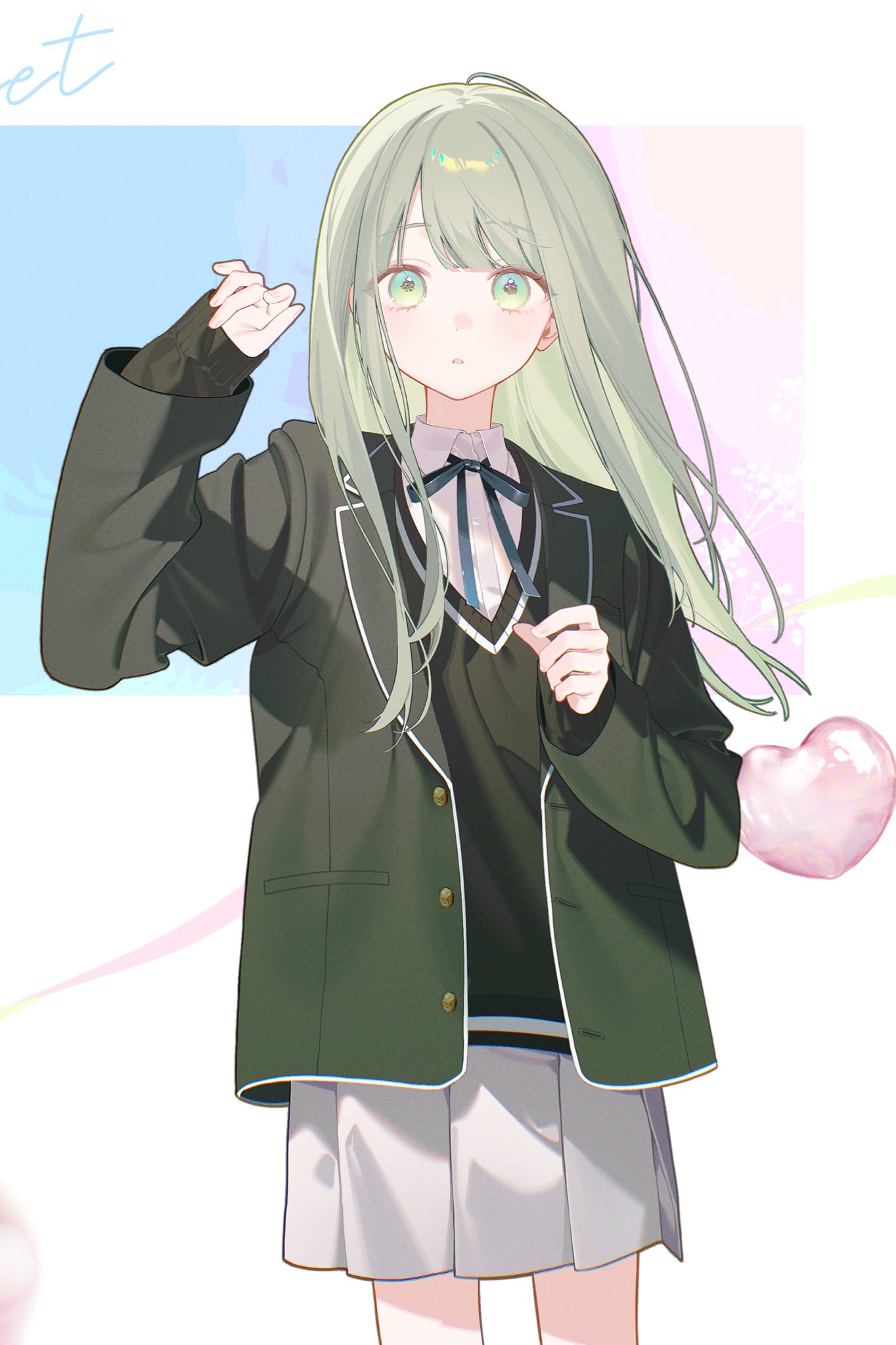 1girlblack sweater vestbordercowboy shotdot commieyelashesfingernailsgradient eyesgreen eyesgreen hairgreen jacketjacketlapelslight blushlong hairlong sleeveslooking at viewermulticolored eyesneck ribbonnotched lapelsoutside borderparted lipspleated skirtribbonschool uniformshirtskirtsolosweater vestwhite shirtwhite skirt