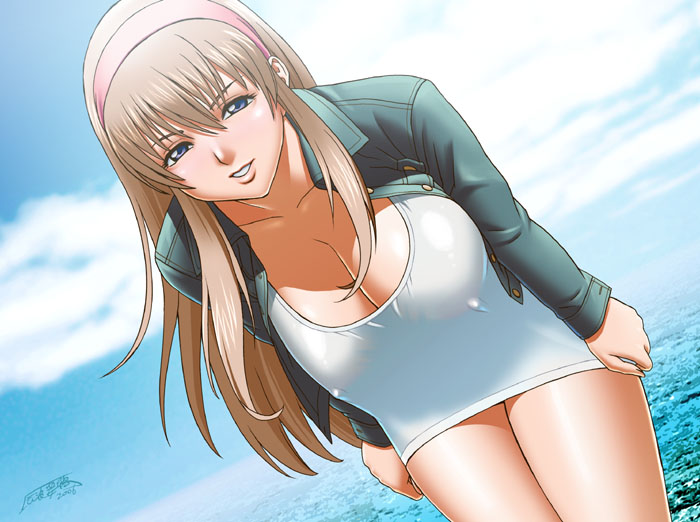 1girlbreastsbrown haircleavagecloudcovered erect nipplesdayfemale focushairbandjacketlarge breastsleaning forwardlong hairskysolo