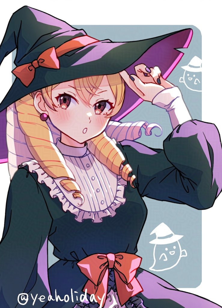:o1girlalternate costumeblack dressblack hatblonde hairbowdressdrill hairearringsghosthair between eyeshalloween costumehathat bowjewelrylooking at vieweropen mouthpuffy sleevessolotwitter usernameupper bodywitch hat