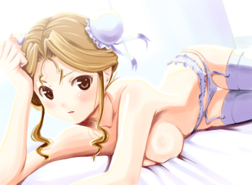 1girlblonde hairblushbrown eyesbun coverdouble bunfemale focusgarter belthair bunlingerielyingpantiessolothighhighstopless femaleunderwearunderwear only