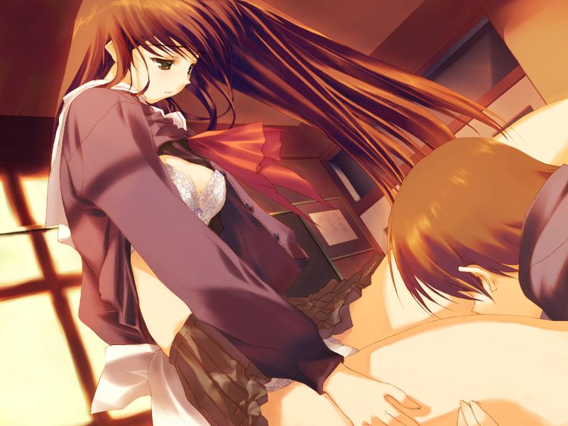 1girlbrabrown hairdeskdutch anglelingerielong hairopen clothesopen shirtpantiesschool uniformshirtsittingsolo focusunderwearupskirt