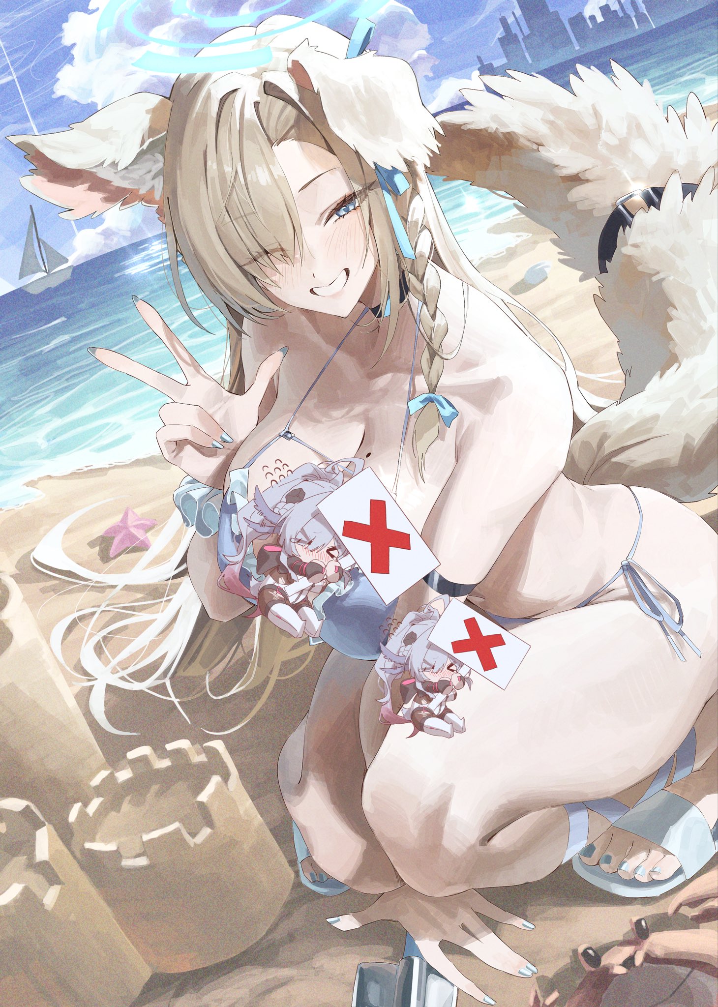 1girlanimal ear fluffanimal earsbare shouldersbeachbikiniblonde hairblue bikiniblue eyesblue halobraidbreastscensoredcleavagecollarbonedog earsdog tailgringroinhair over one eyehalolarge breastslong hairlooking at viewermolemole on breastone eye closedsand castlesand sculpturesandalsside-tie bikini bottomsingle braidsmilesolosquattingswimsuittailthighsvvery long hair