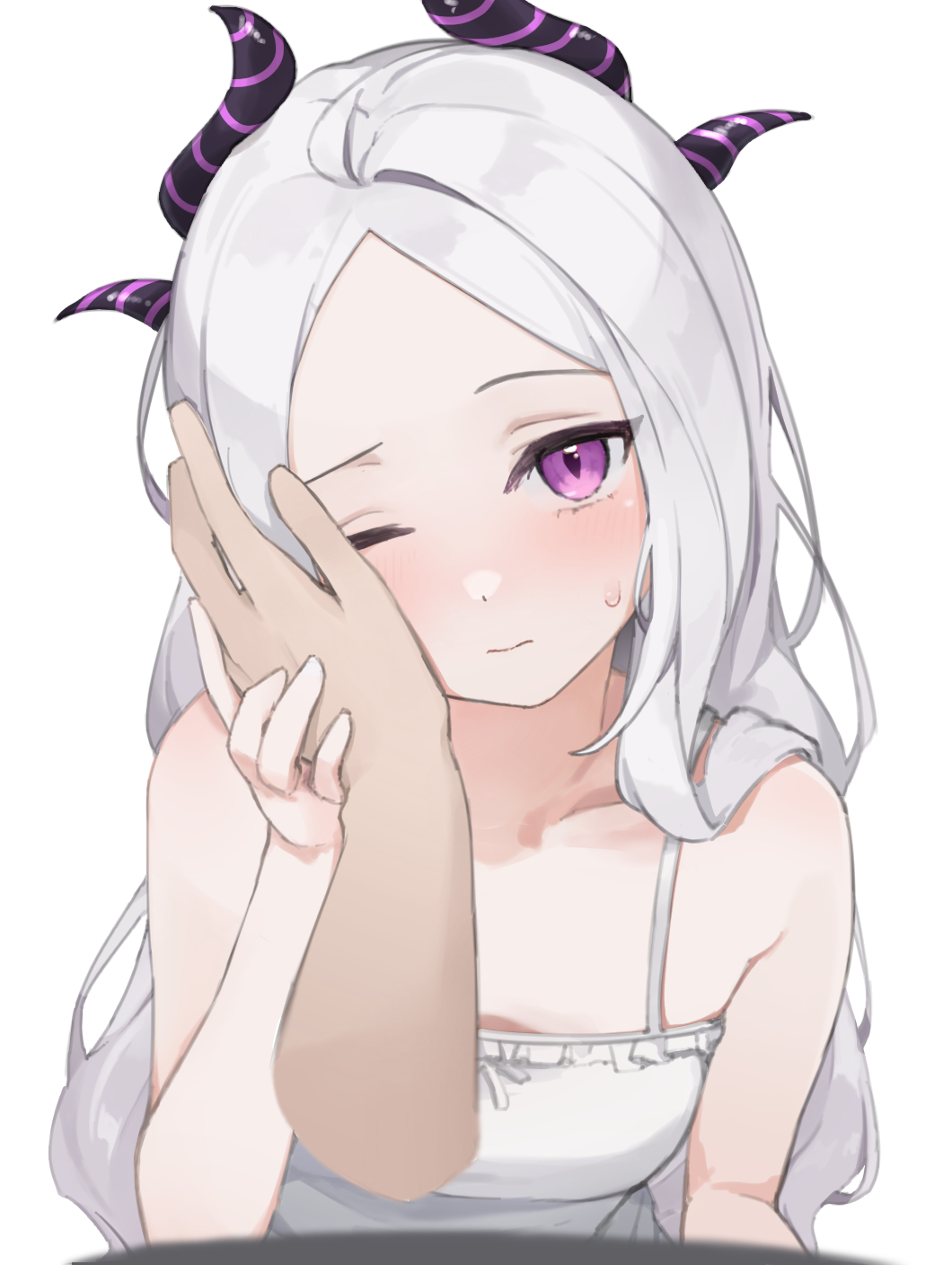 1boy1girlahogeblushbreastsdemon girldemon hornshornslong hairpurple eyessimple backgroundsmall breaststen 222white backgroundwhite hair