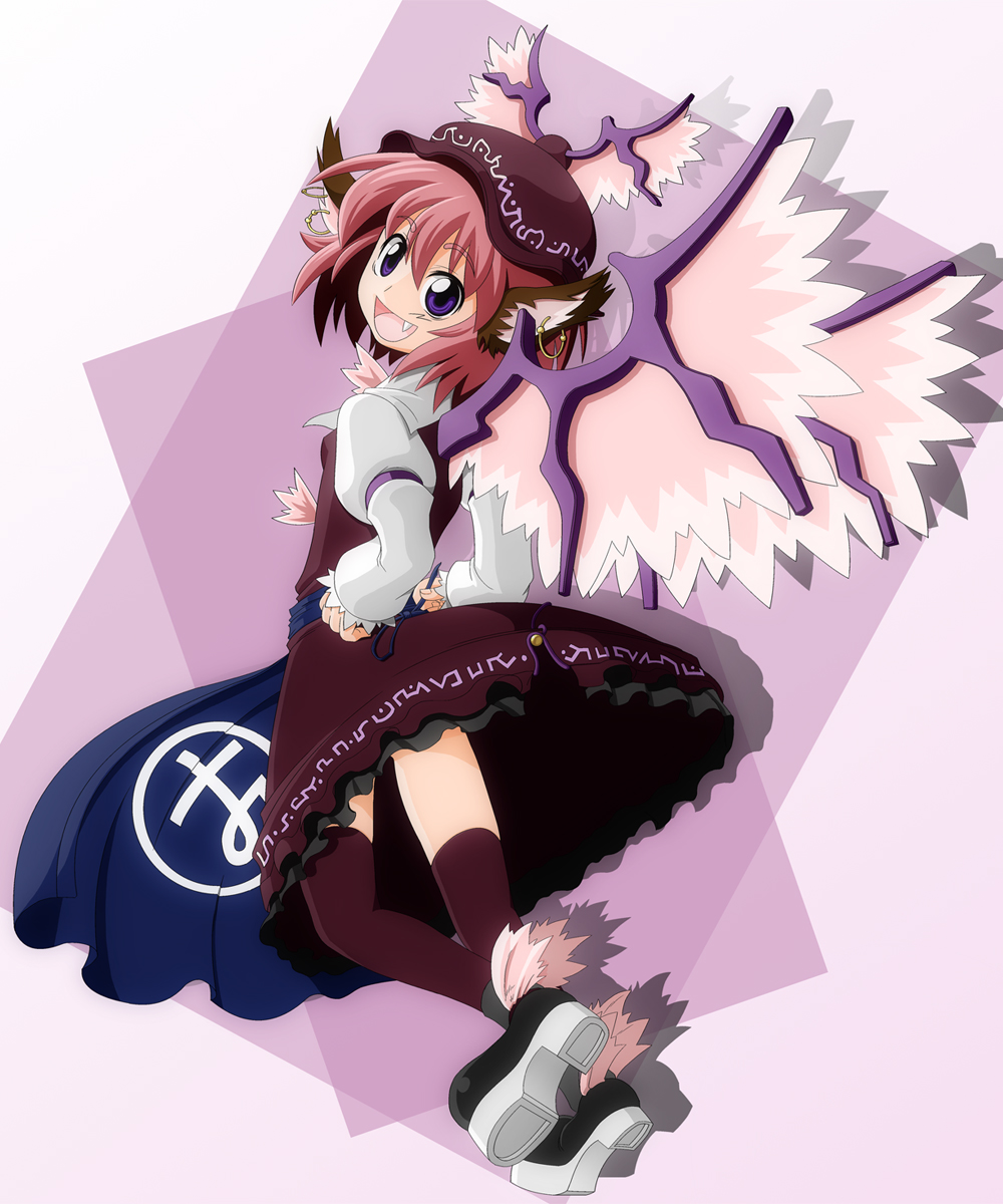 1girlanimal earsearringsfangfemale focusfull bodyhatjewelrypink hairpurple eyesshoesshort hairsolothighhighswings