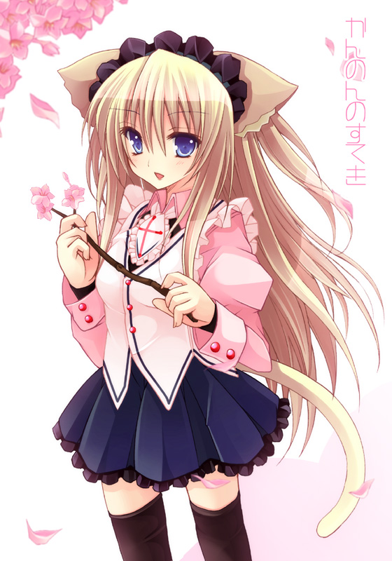 animal earsblack thighhighsblonde hairblue eyescat earscat tailcherry blossomslong hairskirtsolotailthighhighszettai ryouiki