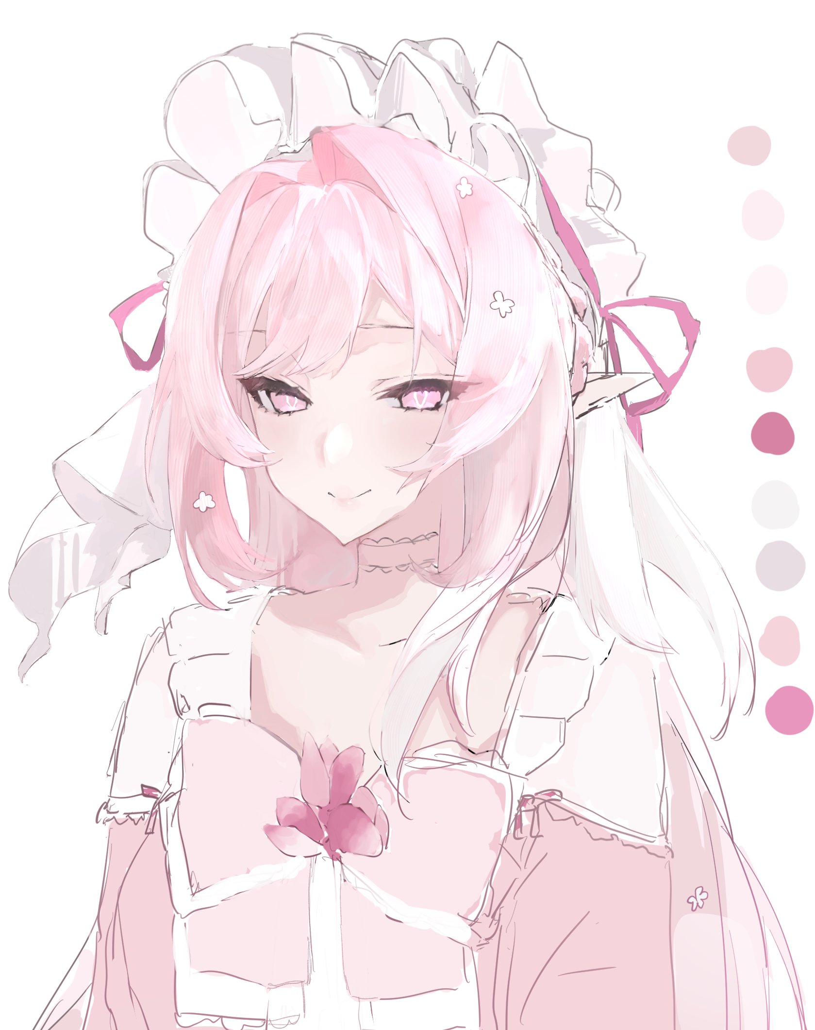1girldiamond (shape)diamond-shaped pupilsdresselflong hairlooking at viewermulticolored hairpink dresspink hairpointy earspurple eyessimple backgroundsmilesolosymbol-shaped pupilstwo-tone hairupper bodyvery long hairwhite backgroundwhite hair