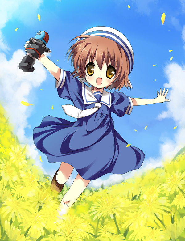 00s1girlascotbrown eyesbrown hairchildclouddaydixie cup hatdressfemale focusfieldflowerhatmilitary hatopen mouthoutdoorsrobotrunningsailor collarsailor dressshort hairskysolotoy