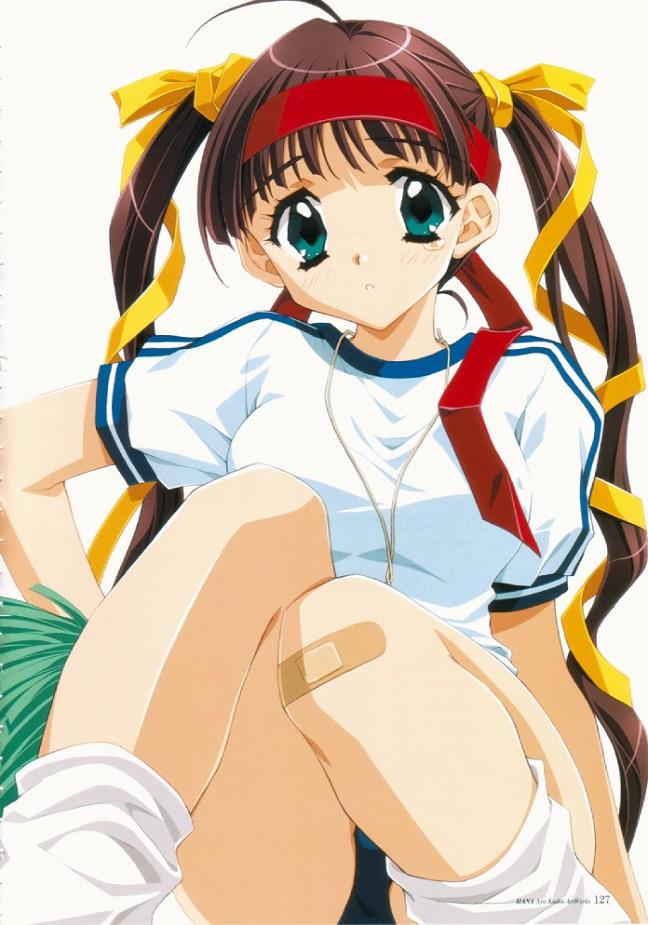 :o1girlahogebandaidbandaid on kneebandaid on legbrown hairfemale focusgreen eyesgym uniformhair ribbonheadbandknees together feet apartknees uplong hairloose sockspage numberparted lipspom pom (cheerleading)puffy short sleevespuffy sleevesribbonshort sleevessimple backgroundsittingsockssolotearstwintailswhite backgroundwhite socksyellow ribbon