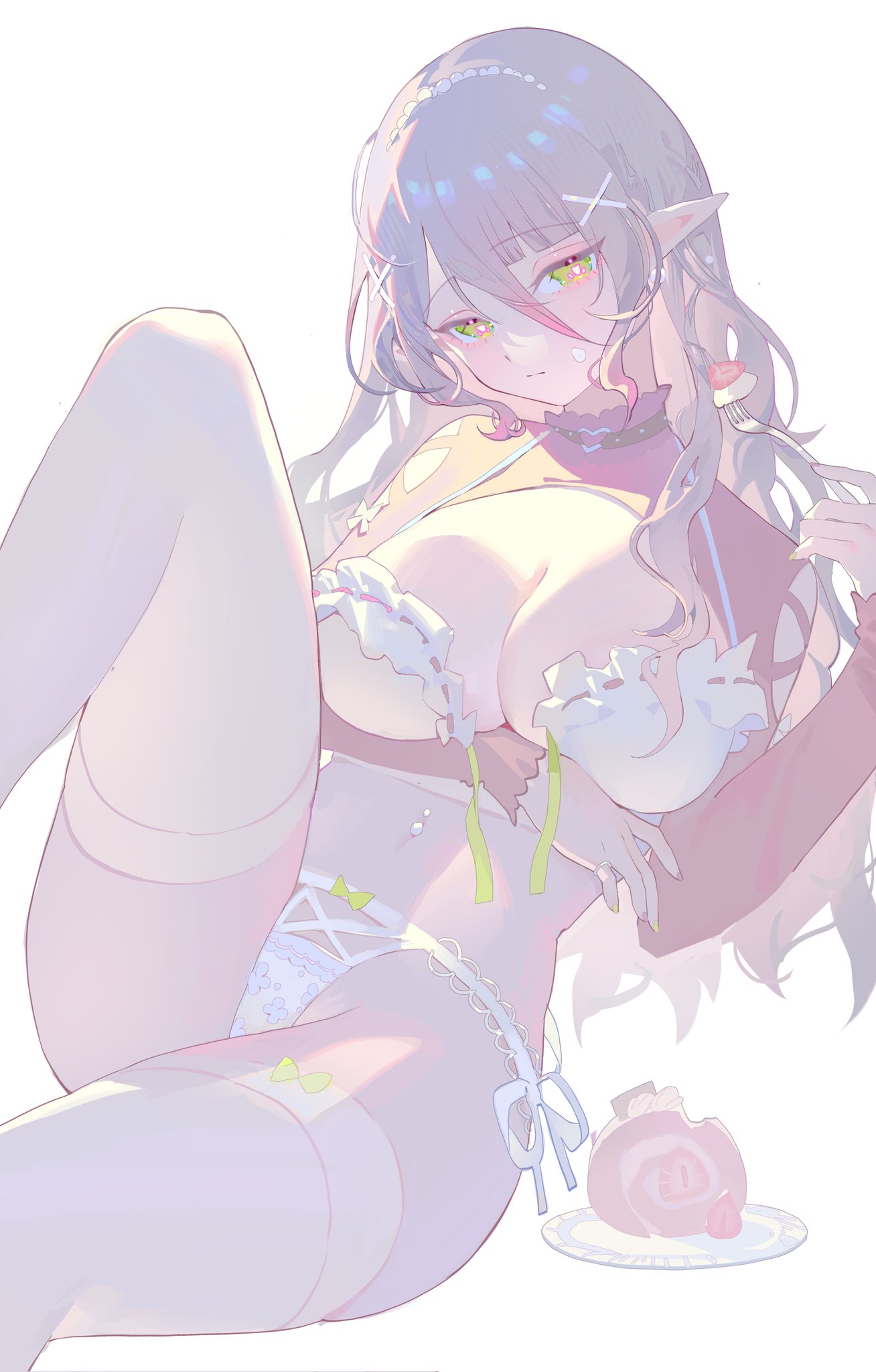 migikoba, pyra (xenoblade), xenoblade chronicles (series), xenoblade chronicles 2, absurdres, highres, 1girl, bar censor, breasts, breasts apart, censored, core crystal (xenoblade), hands up, huge breasts, looking at viewer, lying, medium hair, nipples, nude, on back, orange eyes, purple background, pussy, red hair, sidelocks, simple background, solo, spread legs, swept bangs, thighs, tiara