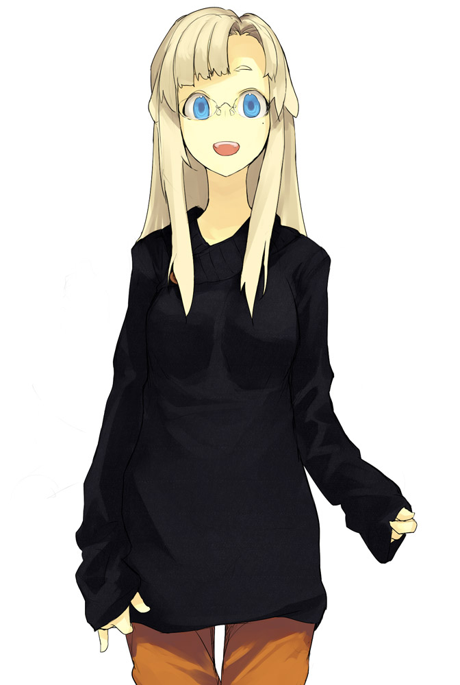 1girlblonde hairblue eyesfemale focusglasseslong hairmolemole under eyeopen mouthoversized clothessmilesolo