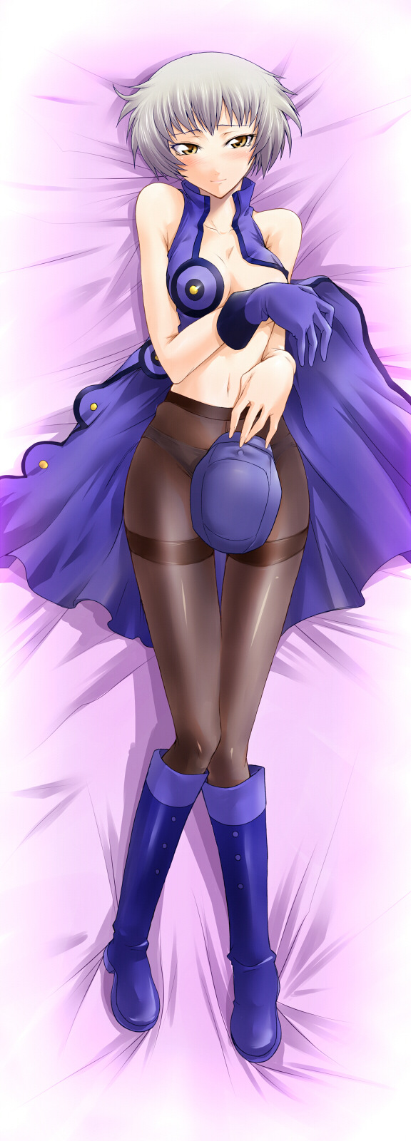 1girlbare shouldersbed sheetblushbootsbreastscleavagecrotch seamdakimakura (medium)dressfemale focusfull bodygarrison capgloveshatlyingmedium breastsnavelpantiespanties under pantyhosepantyhosesee-through clothesshort hairsleevelesssmilesolounderwearyellow eyes