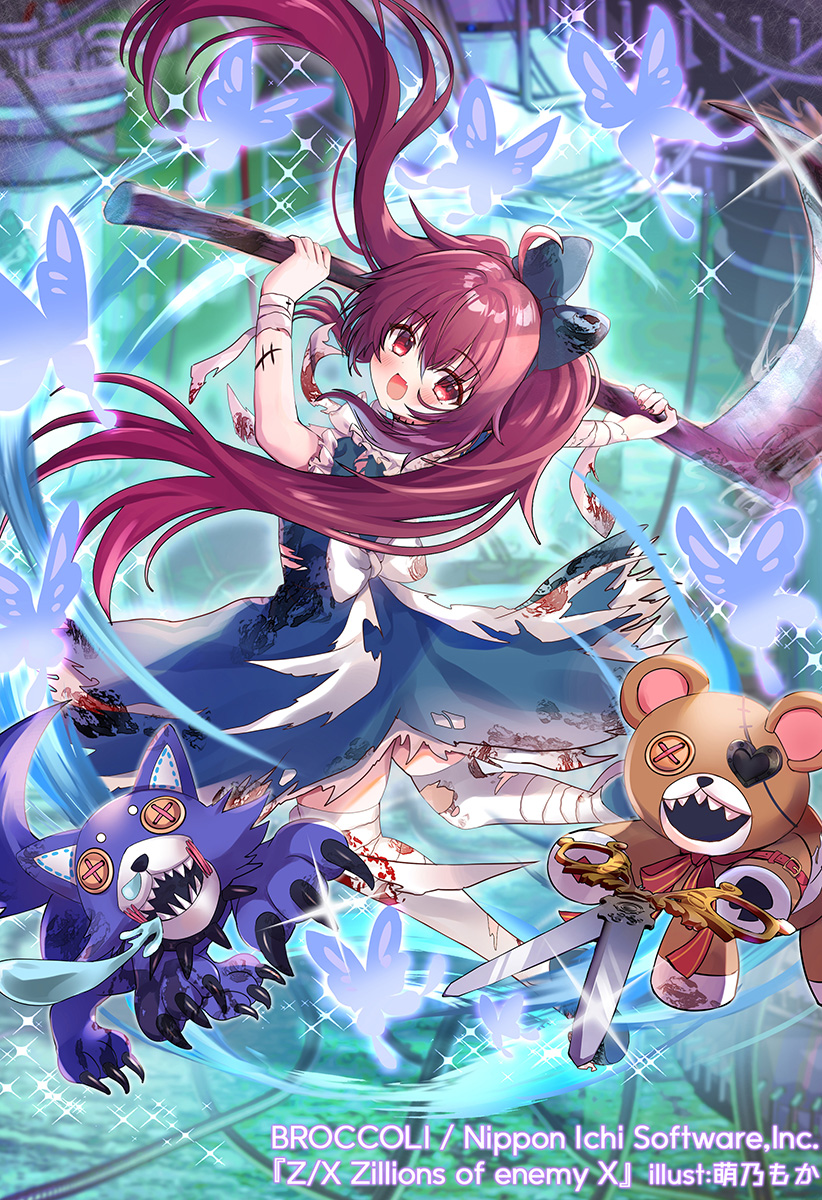 logicon, miakis (suikoden), gensou suikoden, gensou suikoden v, lowres, 1girl, armor, breasts, dual wielding, female focus, holding, knife, miniskirt, orange background, purple eyes, purple hair, skirt, small breasts, solo