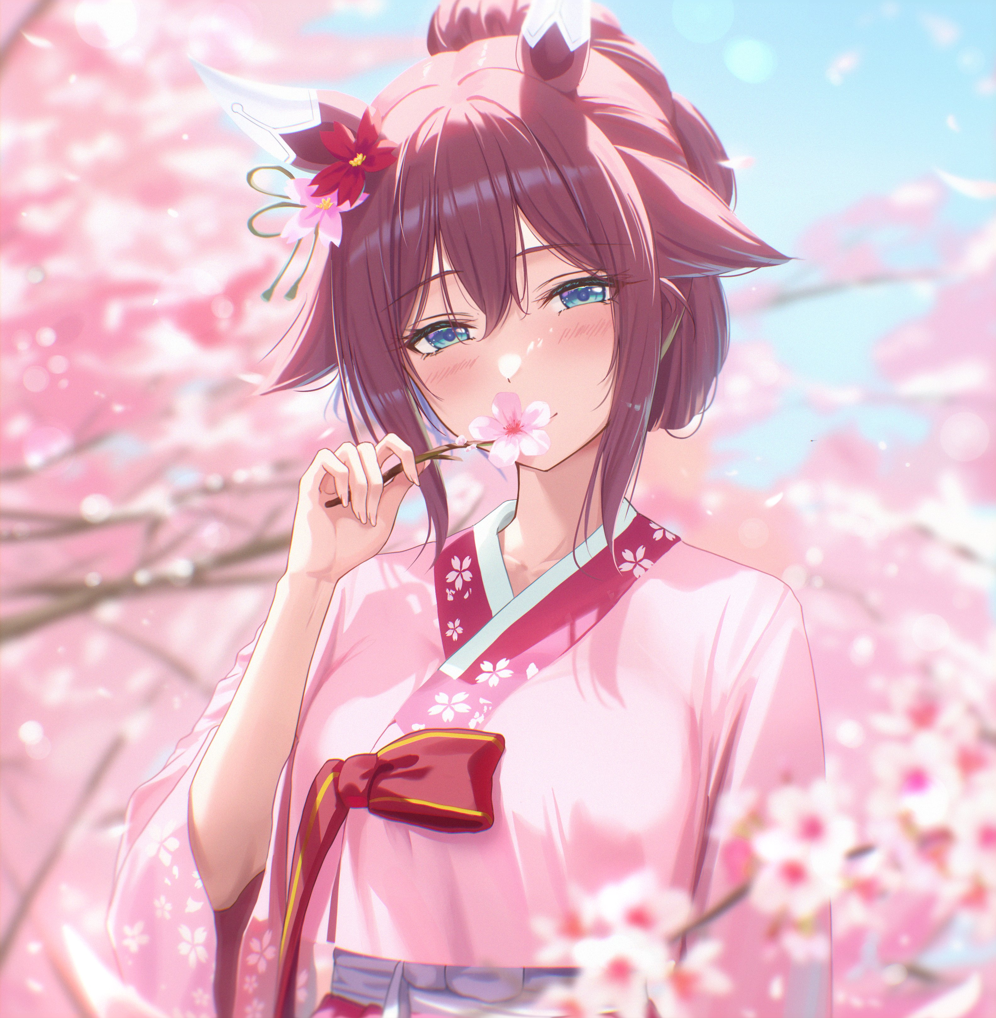 1girlalternate costumeanimal earsblue eyesblurryblushcheck costumecherry blossom printcherry blossomschima (clothes)depth of fieldear coversfloral printflowerhair between eyeshair flapsholdingholding flowerhorse earshorse girlkorean clotheslooking at viewerpink hairpink shirtpink skirtshirtskirtsoloupper body