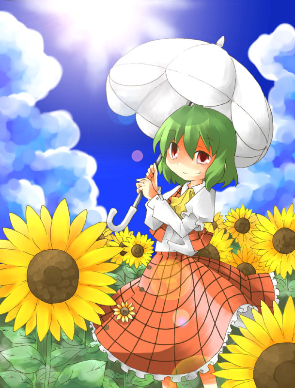 1girlascotclouddayfemale focusfieldflowerflower fieldgreen hairnatureparasolplaid clothesplaid skirtplaid vestred eyesshadeshort hairskirtskirt setsolosunflowersunflower fieldumbrellavest