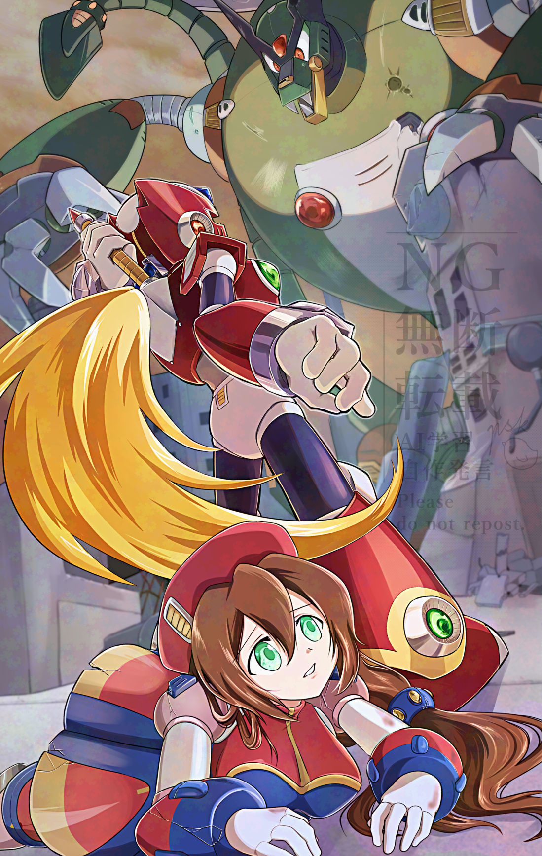 1boy1girl2boysandroidarmorbattle damageberetblonde hairbreastsbrown hairchest jewelclenched teethdirtdragondressenergy sworderegion (mega man)forehead jewelfull bodyglovesgreen eyeshathelmetholdingholding swordholding weaponjewelrylarge breastslong hairlooking at anotherlow-tied long hairmulticolored dressmultiple boysnon-humanoid robotparted lipsred armorred eyesred hatred helmetrobotrobot dragonrobot earsrobot girlstandingswordteethvery long hairweaponwhite glovesz saber