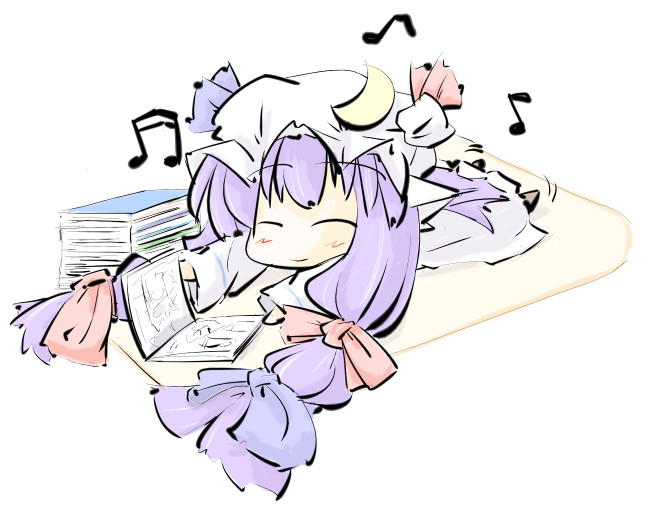 1girlchibicrescentcrescent hat ornamentfemale focushathat ornamentimageboard desourcedlong hairmusical notepurple hairsolo
