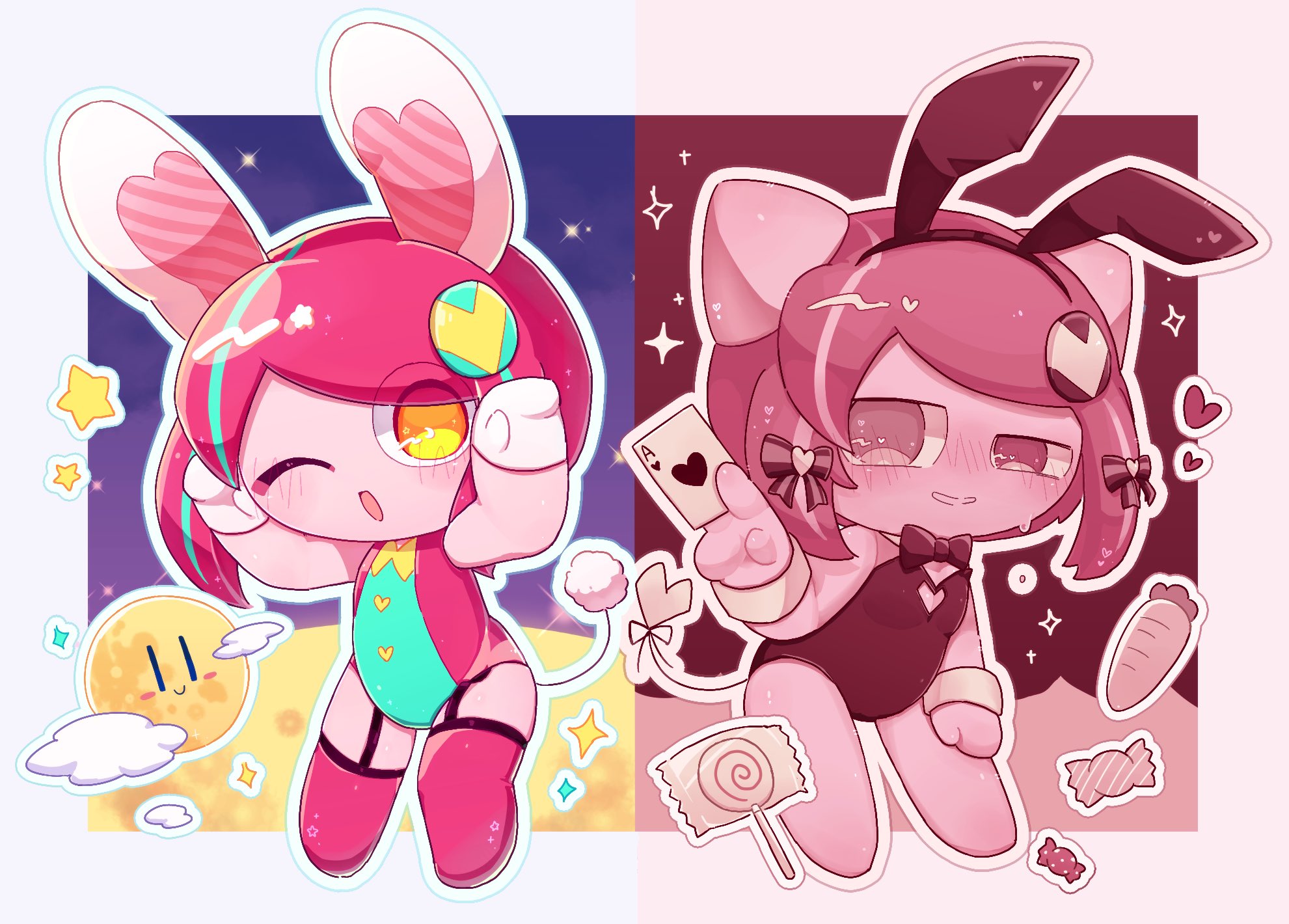 :o2girlsadapted costumeanimal ear hairbandanimal earsaqua hairbarefootblack bowblack bowtieblack hairbandblack leotardbootsbowbowtiecandycardcarrotchibiclothing cutoutdual personafake animal earsfoodfull moongloveshair bowhairbandheartheart cutoutheart tailheterochromiaholdingholding cardleotardlollipopmoonmulticolored hairmultiple girlsmultiple hair bowsofficial alternate costumeofficial alternate eye colorone eye closedorange eyespink bootspink eyespink hairpink leotardplayboy bunnyplaying cardrabbit earsrabbit girlrabbit tailshort hairstar (symbol)streaked hairswept bangstailthigh bootsuneven eyeswhite gloveswrist cuffs