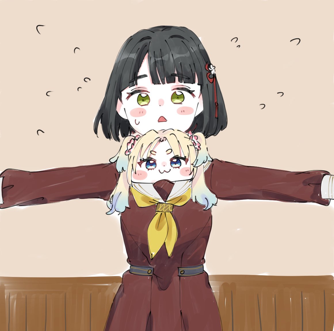 :3:d2girlsblack hairblonde hairblue eyesblue hairblunt bangsblunt endsblush stickersbob cutbrown dresschibiclosed mouthdressflowerflying sweatdropsgradient hairgreen eyeshair flowerhair ornamenthasu no sora school uniformlong sleeveslooking at viewermini person in clothesmulticolored hairmultiple girlsneckerchiefopen mouthoutstretched armspink flowerpleated dresssailor collarsailor dressschool uniformshort hairspread armstwintailsvirtual youtuberwhite sailor collarwinter uniformyellow neckerchief