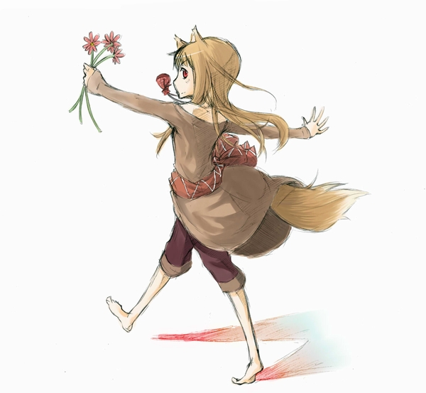 00sanimal earsbarefootbrown hairflowerlong hairred eyessketchsolotailwalkingwolf earswolf tail