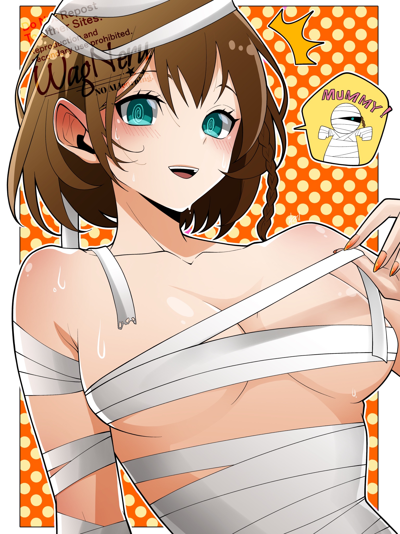 1boy1girlbandagesbare shouldersblushbraidbreastsbrown haircleavagegreen eyeslarge breastslooking at viewermummymummy costumenaked bandageopen mouthshort hairside braidsmilesolo
